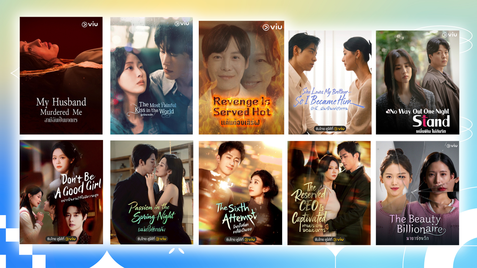 นอกจากนี้ยังมี ซีรีส์พล็อตเข้มข้นอย่าง “The Beauty Billionaire-มายาซ่อนรัก” เมื่อหญิงสาวฐานะธรรมดา ฟื้นขึ้นมาหลังอุบัติเหตุและพบว่า เธอถูกศัลยกรรมใบหน้า จนกลายเป็นทายาทสาวตระกูลมหาเศรษฐี เธอจึงปลอมเป็นคนใหม่เพื่อเอาคืนคนที่ทำลายชีวิตของเธอ รวมถึงซีรีส์แฟนตาซีอย่าง “The Most Painful Kiss In The World-จูบรักบาดลึก” หญิงสาวที่สามารถโอบรับความเจ็บปวดของคนอื่นผ่านการจูบ รวมถึงซีรีส์โรแมนติกจิกกัดอย่าง “No Way Out One Night Stand-หนึ่งคืน ไม่ลืมรัก” เรื่องราวสาวโสดวัยใกล้เลข 4 ที่ดันมาบังเอิญเจอกับหนุ่มคนหนึ่งที่ดูไม่ค่อยถูกชะตา แต่โชคชะตากลับพาพวกเขาให้ใกล้ชิดกันซะงั้น