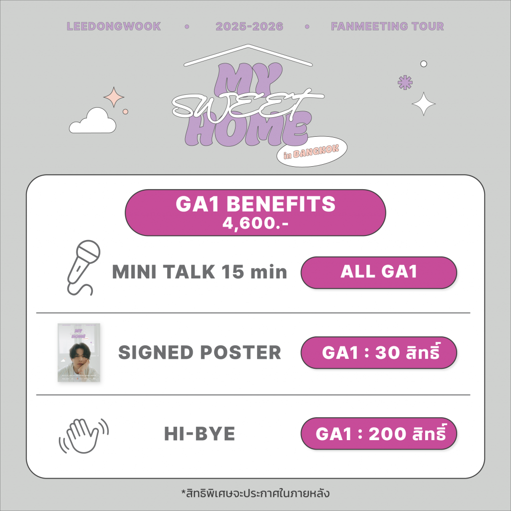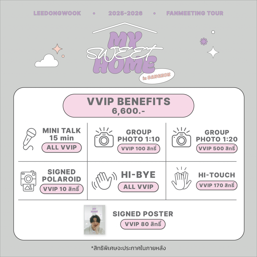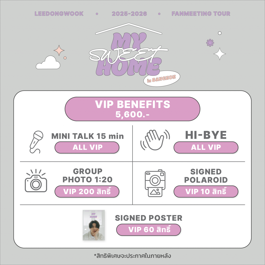 ทุกระดับราคามาพร้อมแพ็กเกจสิทธิพิเศษแน่นครบ ทั้ง Mini Talk, Hi-Bye, Hi-Touch, Group Photo, Signed Polaroid, Signed Poster, Photo Card และ Official Poster เพิ่มโอกาสลุ้นใกล้ชิดในหลากหลายรูปแบบ เรียกได้ว่าไม่ว่าจะนั่งโซนไหน ก็มีสิทธิ์สร้างโมเมนต์สุดพิเศษกับอี ดงอุคได้เหมือนกัน ประกาศสิทธิพิเศษ(Fan Benefits)วันที่ 12 มีนาคม 2569 นี้