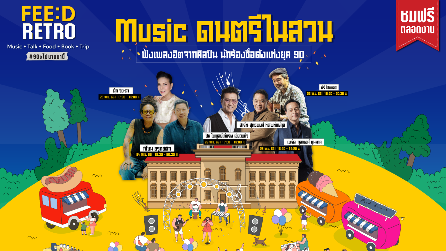 ในบรรยากาศแบบนั้น จึงอยากเชิญชวนทุกท่านไปร่วมกิจกรรมดนตรีในสวนยามเย็นถึงค่ำ ที่สนามหญ้าข้างมิวเซียมสยาม (MRT สนามไชย) ภายในงาน FEED RETRO Music •Talk • Food • Book • Trip #90ไม่นานมานี้ ระหว่างวันศุกร์ที่ 24 จนถึงวันอาทิตย์ที่ 26 พฤศจิกายน ณ มิวเซียมสยาม