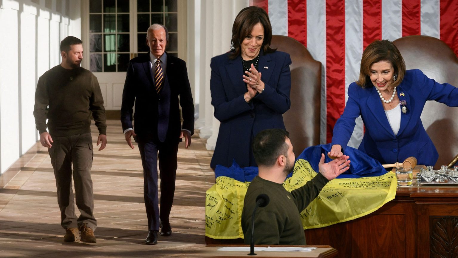 ในช่วงท้ายเซเลนสกียังได้ส่งมอบธงชาติยูเครนที่มีลายเซ็นของทหารในพื้นที่บักห์มุตแก่ “แนนซี เพโลซี” ประธานสภาผู้แทนราษฎรสหรัฐฯ โดยเพโลซีได้ส่งมอบธงชาติสหรัฐฯ เป็นการแลกเปลี่ยน