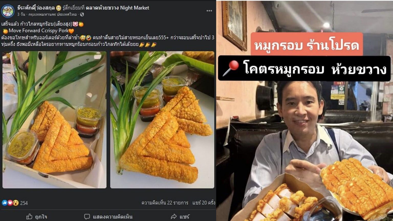 พร้อมระบุข้อความว่า “หมูกรอบที่คุณพิธา โปรดปราน รีบตามมาตำกันเลยนะ ของเค้ากรอบจริงน้ำจิ้มก็แซ่บ #โคตรหมูกรอบห้วยขวาง #ตลาดนัดห้วยขวางกลางคืน”