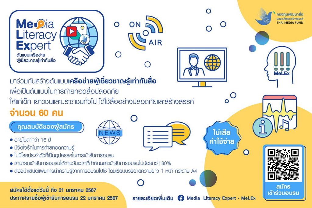 ขอเชิญชวนผู้ที่สนใจเข้าร่วมการอบรมต้นแบบเครือข่ายผู้เชี่ยวชาญรู้เท่าทันสื่อ Media Literacy Expert (MeLEx) มาร่วมกันสร้างต้นแบบเครือข่ายผู้เชี่ยวชาญรู้เท่าทันสื่อ เพื่อเป็นต้นแบบในการถ่ายทอดสื่อปลอดภัย ให้แก่เด็ก เยาวชนและประชาชนทั่วไป ได้ใช้สื่ออย่างปลอดภัยและสร้างสรรค์ เข้าร่วมฟรี (ไม่มีค่าใช้จ่าย) รับจำนวนจำกัดเพียง 60 คนเท่านั้น สามารถสมัครได้ตั้งแต่วันนี้ จนถึง 21 มกราคม 2567 รายละเอียดเพิ่มเติม Facebook : Media Literacy Expert – MeLEx