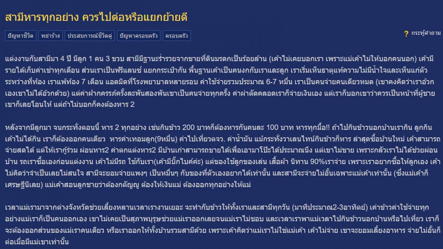 ภรรยารายหนึ่งได้ตั้งกระทู้ระบาย และปรึกษาปัญหาชีวิต หลังจากมองว่าสามีของเธอนั้นค่อนข้าง “เห็นแก่ตัว” ขี้งกแม้กระทั่งกับภรรยาและลูก