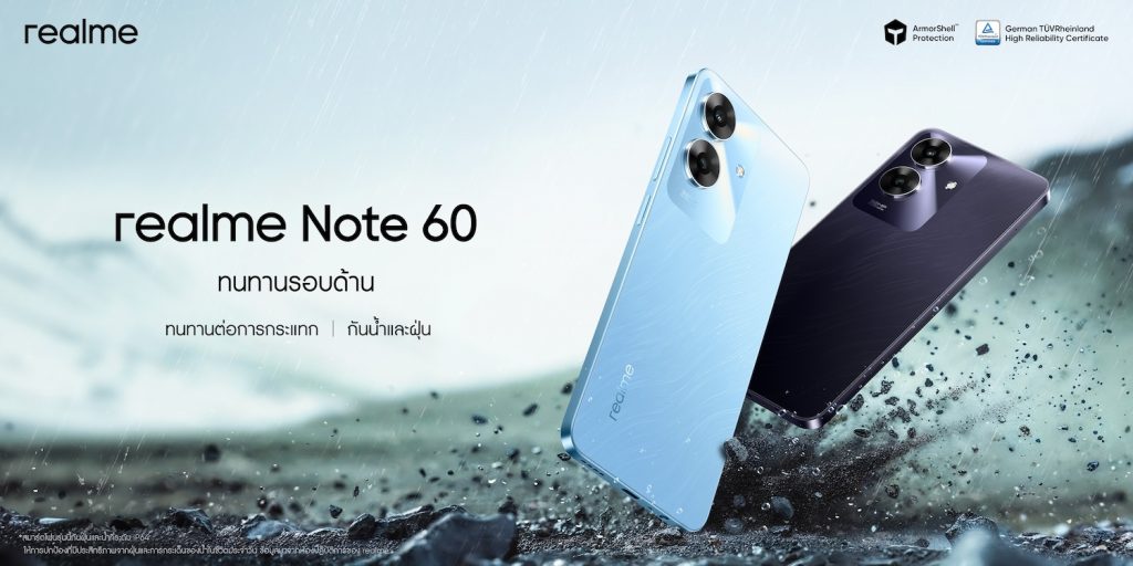 ใครบอกว่ามือถือราคาประหยัดต้องพังง่าย!วันนี้ realme (เรียลมี) แบรนด์สมาร์ตโฟนเพื่อคนรุ่นใหม่ที่เติบโตเร็วที่สุดในโลก จะเปลี่ยนความคิดของคุณด้วยบัดเจ็ตโฟนรุ่นใหม่ในตระกูล NOTE Series ที่ทุกคนจับตามอง กับ “realme Note 60” ชูจุดเด่นเรื่องความแข็งแกร่งจากกลไกการปกป้องสมาร์ตโฟนรอบด้านแบบ 360° ในชื่อ ArmorShell™ Protection ครั้งแรกในสมาร์ตโฟน realme ผ่านการอัปเกรดองค์ประกอบบอดี้ทั้ง 8 ด้าน อาทิ การใช้โครงสร้างอะลูมิเนียมหล่อขึ้นรูปแข็งแกร่งสูง กระจกเสริมแรง ฟิล์มแผงวงจรดูดซับแรงกระแทก ฯลฯ เพื่อสร้างบัดเจ็ตโฟนที่ทนทานต่อการบิดงอ ตกกระแทก รอยขีดข่วน และการใช้งานหนักทุกรูปแบบ แถมมาพร้อมคุณสมบัติ IP64 ที่ช่วยกันน้ำกันฝุ่นจากการใช้งานประจำวันได้อย่างมั่นใจ