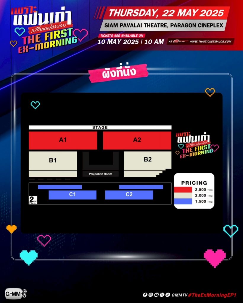 สำหรับผู้ที่สนใจสามารถจับจองบัตรเข้าร่วมงาน “เพราะแฟนเก่าเปลี่ยนแปลงบ่อย : The First Ex-Morning” โดยเปิดจำหน่ายบัตร ในวันเสาร์ที่ 10 พฤษภาคมนี้ เวลา 10.00 น. เป็นต้นไป บัตรราคา 2,500 / 2,000 / 1,500 บาท ที่ ไทยทิคเก็ตเมเจอร์ทุกสาขา, www.thaiticketmajor.com และ Call Center โทร 0-2262-3456 ติดตามรายละเอียดเพิ่มเติมได้ที่เว็บไซต์ : www.thaiticketmajor.com Facebook : www.facebook.com/gmmtvofficial และ Instagram & X & TikTok & YouTube & Weibo : GMMTV