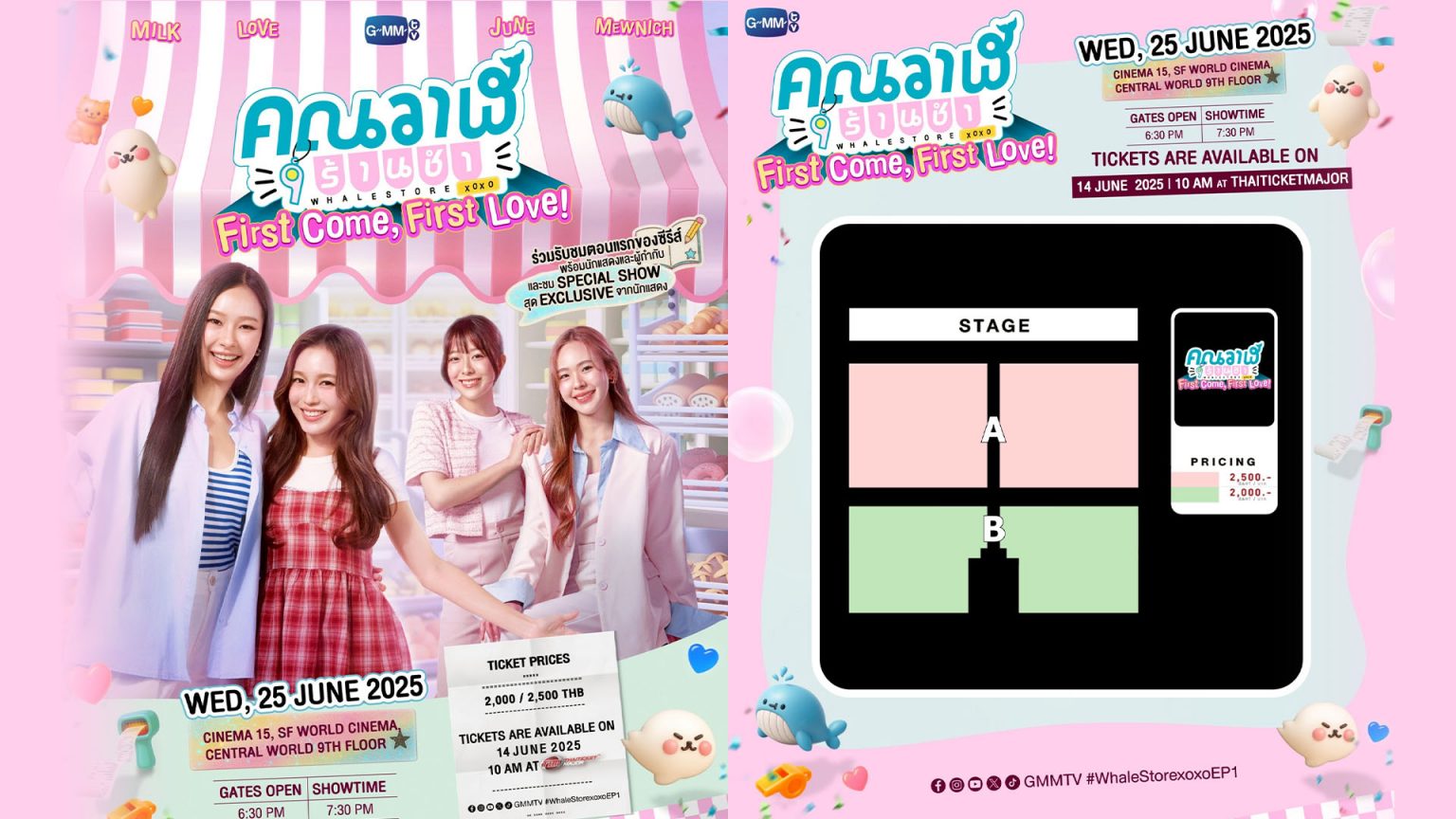 เตรียมล็อคคิวสัมผัสโมเมนต์ฟินแห่งปีกับงาน “คุณวาฬร้านชำ First Come, First Love!” จาก GMMTV คอนเทนต์โพรไวเดอร์ชั้นนำของเมืองไทยในวันพุธที่ 25 มิถุนายน 2568 ตั้งแต่เวลา 19.30 น. เป็นต้นไป ณ CINEMA 15, SF WORLD CINEMA, CENTRAL WORLD ชั้น 9 ที่เหล่านักแสดงนำสุดฮอต “มิ้ลค์-พรรษา วอสเบียน, เลิฟ-ภัทรานิษฐ์ ลิ้มปติยากร, จูน-วรรณวิมล เจนอัศวเมธี, มิวนิค-นันท์นภัส เลิศนามเชิดสกุล” จับมือชวนแฟนๆ มาร่วมเปิดร้านชำวันแรกไปด้วยกัน พร้อมดูตอนแรกซีรีส์ “คุณวาฬร้านชำ Whale Store xoxo” ร้านชำใกล้ใจ จะรักอะไรเพิ่มไหมคะ? ซีรีส์ฟีลกู๊ดฮีลใจทุกคนที่มัดรวมความน่ารักสดใสแบบฉ่ำ ซึ่งจะรับชมพร้อมกับทีมนักแสดงและผู้กำกับฯ คนเก่ง “สกล วงษ์สินธุ์วิเสส” และเตรียมฟินไปกับ Special Show สุด Exclusive จากนักแสดง รวมถึงรับความสุขสุดขีดจากโมเมนต์น่ารักๆ ในการสัมภาษณ์พิเศษ และพูดคุยถึงเบื้องลึกเบื้องหลังซีรีส์สุดอบอุ่น งานนี้แฟนๆ โกยความฟินกลับบ้านไปแบบจุกๆ แน่นอน