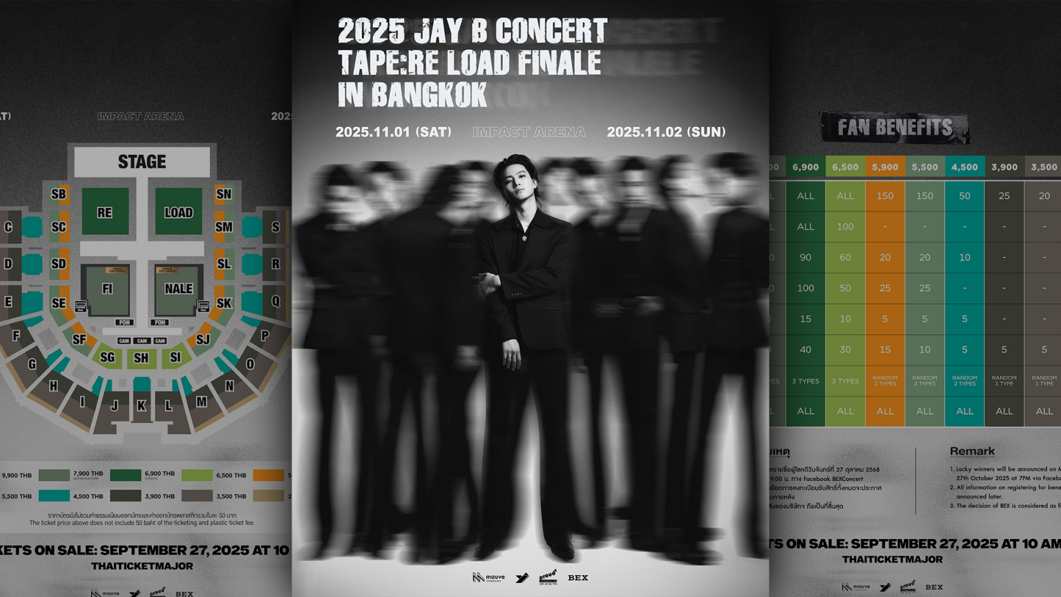 เตรียมกรี๊ดให้สุดเสียง! “JAY B” (เจบี) ศิลปินมากความสามารถแห่ง MAUVE Company กลับมาเสิร์ฟความฟินให้กับอากาเซ่ชาวไทยอีกครั้ง กับคอนเสิร์ตเต็มรูปแบบ 2025 JAY B CONCERT [TAPE:RE LOAD FINALE] IN BANGKOK เจบีลีดเดอร์คนเก่งพร้อมมอบ “ความพิเศษ” ให้แฟน ๆ ชาวไทยอยู่เสมอในทุกครั้งที่ได้กลับมาเล่นคอนเสิร์ตที่บ้านหลังนี้ ซึ่งคอนเสิร์ตครั้งนี้เจบีไม่ได้มาเล่น ๆ เพราะเตรียมมอบประสบการณ์สุดพิเศษที่ “ใกล้” และ “เข้าถึง” กว่าเดิม พร้อมด้วยโชว์คุณภาพระดับอินเตอร์ แสง สี เสียง และโปรดักชันสุดอลังการที่ไม่เคยทำให้แฟน ๆ ต้องผิดหวัง งานนี้ยังได้ทีมผู้จัดคอนเสิร์ตมือโปรที่เจบีไว้วางใจมาโดยตลอดอย่าง BEX (บริษัทในเครือเวิร์คพอยท์กรุ๊ป) กลับมาร่วมงานอีกครั้ง พร้อมด้วย YJ PARTNERS และ PROUD2 จับมือร่วมผลิตโชว์สุดประทับใจ ที่การันตีว่าทุกวินาทีจะเต็มไปด้วย “เซอร์ไพรส์” และความทรงจำดี ๆ ระหว่างเจบีกับแฟน ๆ ชาวไทยอย่างแน่นอน