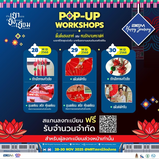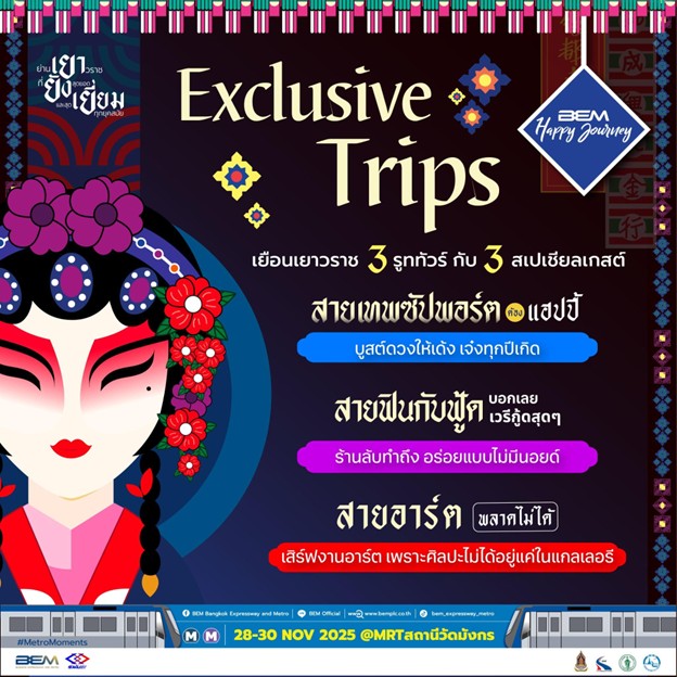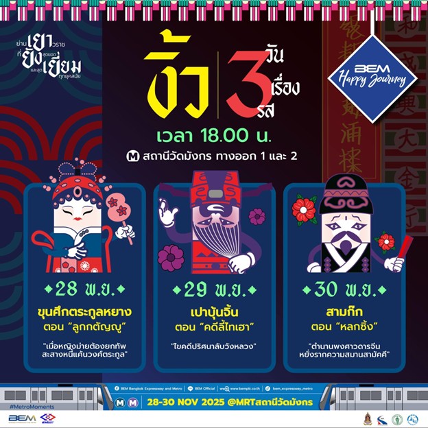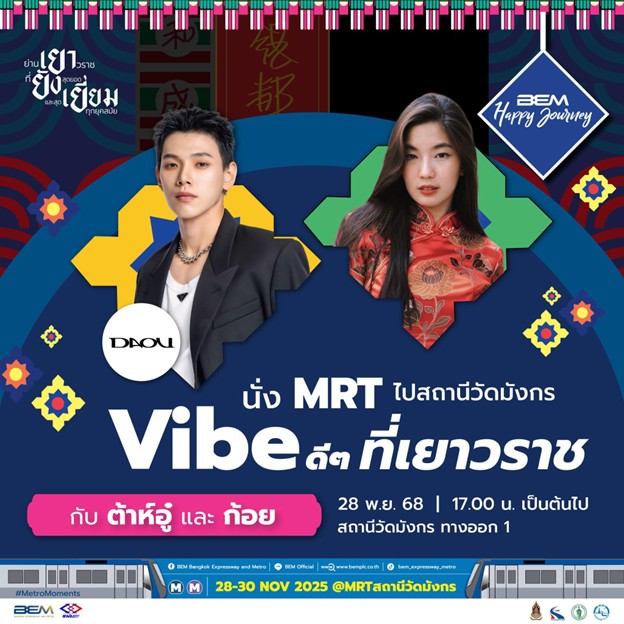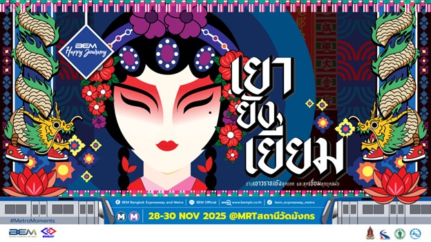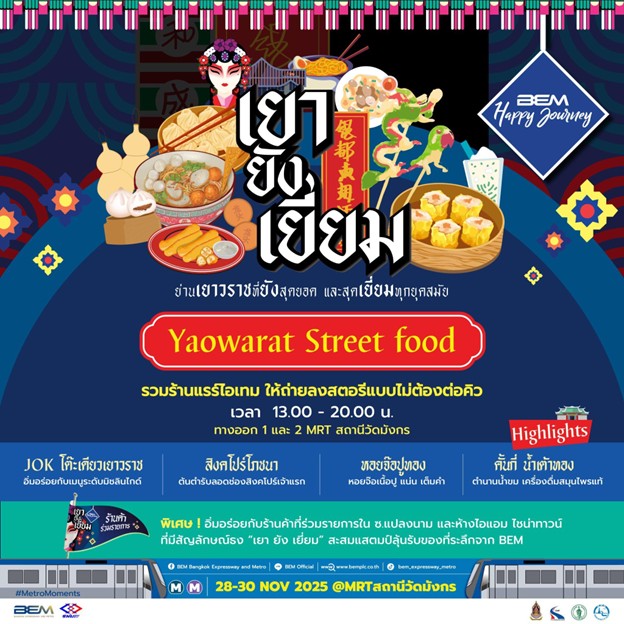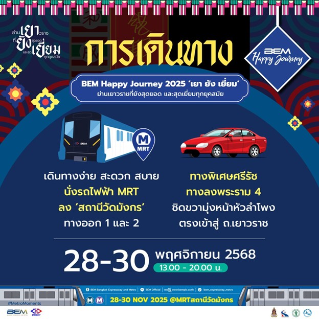 BEM ชวนลูกค้าคนพิเศษนั่ง MRT ลงสถานีวัดมังกร เปิดประตูสู่เยาวราช ย่านคัลเจอร์ร่วมสมัยไทย–จีนที่ยังคงมีชีวิตถนนสายมังกรไม่เคยหลับใหลกับงาน BEM Happy Journey 2025 ‘เยา ยัง เยี่ยม’ ย่านเยาวราชที่ยังสุดยอด และสุดเยี่ยมทุกยุคสมัย จัดโดย บริษัท ทางด่วนและรถไฟฟ้ากรุงเทพ จำกัด (มหาชน) หรือ BEM ร่วมกับการรถไฟฟ้าขนส่งมวลชนแห่งประเทศไทย หรือ รฟม. ชมนิทรรรศการเยา ยัง เยี่ยม ค้นหาเสน่ห์ของงิ้วกันแบบสดๆ ใช้เวลาไปกับเวิร์กชอป เดินชิลชม-แชะ-ชิม รอบเยาวราช จัดเต็มความสุขและความสนุก 3 วันเต็มอิ่ม 28-30 พฤศจิกายนนี้