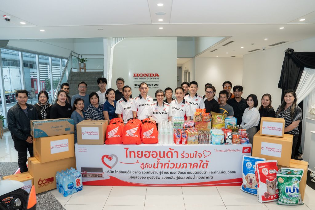 บริษัท ไทยฮอนด้า จำกัด ร่วมกับร้านผู้จำหน่ายรถจักรยานยนต์ฮอนด้าทั่วประเทศ พร้อมกับกองทุนฮอนด้าเคียงข้างไทย และคณะสื่อมวลชน เดินหน้าส่งต่อความห่วงใยสู่พี่น้องประชาชนที่ได้รับผลกระทบจากสถานการณ์อุทกภัยในพื้นที่อำเภอหาดใหญ่ จังหวัดสงขลา ภายใต้โครงการ “ไทยฮอนด้า ช่วยผู้ประสบภัยน้ำท่วม หาดใหญ่” ด้วยการมอบถุงยังชีพรวมทั้งสิ้น 8,603 ถุง คิดเป็นมูลค่ารวมกว่า 5,161,800 บาท เพื่อบรรเทาความเดือดร้อนและช่วยเหลือด้านการดำรงชีวิตในช่วงวิกฤต