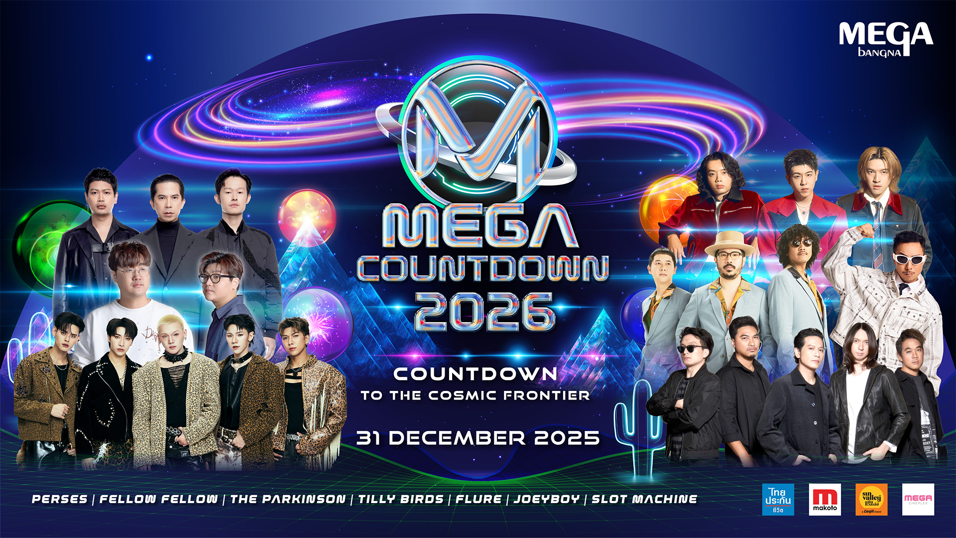 ศูนย์การค้าเมกาบางนา แหล่งช้อปปิ้งที่ใหญ่ที่สุดแห่งกรุงเทพฯ ฝั่งตะวันออก พร้อมเติมเต็มประสบการณ์การใช้ชีวิตให้ทุกๆ วันมีความสุขมากยิ่งขึ้น ด้วยแนวคิด YOUR EVERYDAY MEETING PLACE เดินหน้าจัดเต็มความพร้อม ต้อนรับทุกคนสู่มหกรรมคอนเสิร์ตเคานต์ดาวน์ที่ใหญ่ที่สุดในกรุงเทพฯ ฝั่งตะวันออก ในงาน “MEGA COUNTDOWN 2026” ที่ได้ร่วมกับ บริษัท ไทยประกันชีวิต จำกัด (มหาชน), ผู้จัดจำหน่ายเก้าอี้นวดไฟฟ้า แบรนด์ MAKOTO,ซันแวลเล่ย์ และ เมกา ซีนีเพล็กซ์ พาทุกคนเดินทางท่องจักรวาลแห่งความสุขจากเสียงดนตรี ที่เต็มไปด้วยแสง สี เสียงสุดตระการตา และคอนเสิร์ตจาก 7 ศิลปินชื่อดัง นำโดย PERSES, FELLOW FELLOW, THE PARKINSON, TILLY BIRDS, FLURE, JOEYBOY และปิดท้ายด้วย SLOT MACHINE เสิร์ฟความบันเทิงกันต่อเนื่อง 9 ชั่วโมงเต็ม ในวันที่ 31 ธ.ค. 68 ตั้งแต่เวลา 15.00 น. เป็นต้นไป ที่ศูนย์การค้าเมกาบางนา