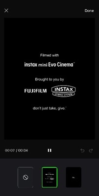 (4) แอปพลิเคชันไว้สำหรับดูและปรับแต่งวิดีโอได้ง่ายๆ ใช้งานร่วมกับแอปพลิเคชัน instax mini Evo เพื่อเช็กวิดีโอที่ถ่ายด้วย mini Evo Cinema บนสมาร์ตโฟน นอกจากการเชื่อมต่อด้วย Bluetooth แล้ว ยังสามารถเชื่อม Wi-Fi เพื่อการส่งไฟล์ที่รวดเร็วยิ่งขึ้น พร้อมดูตัวอย่างและเลือกรูปหรือวิดีโอก่อนส่งได้ทันที