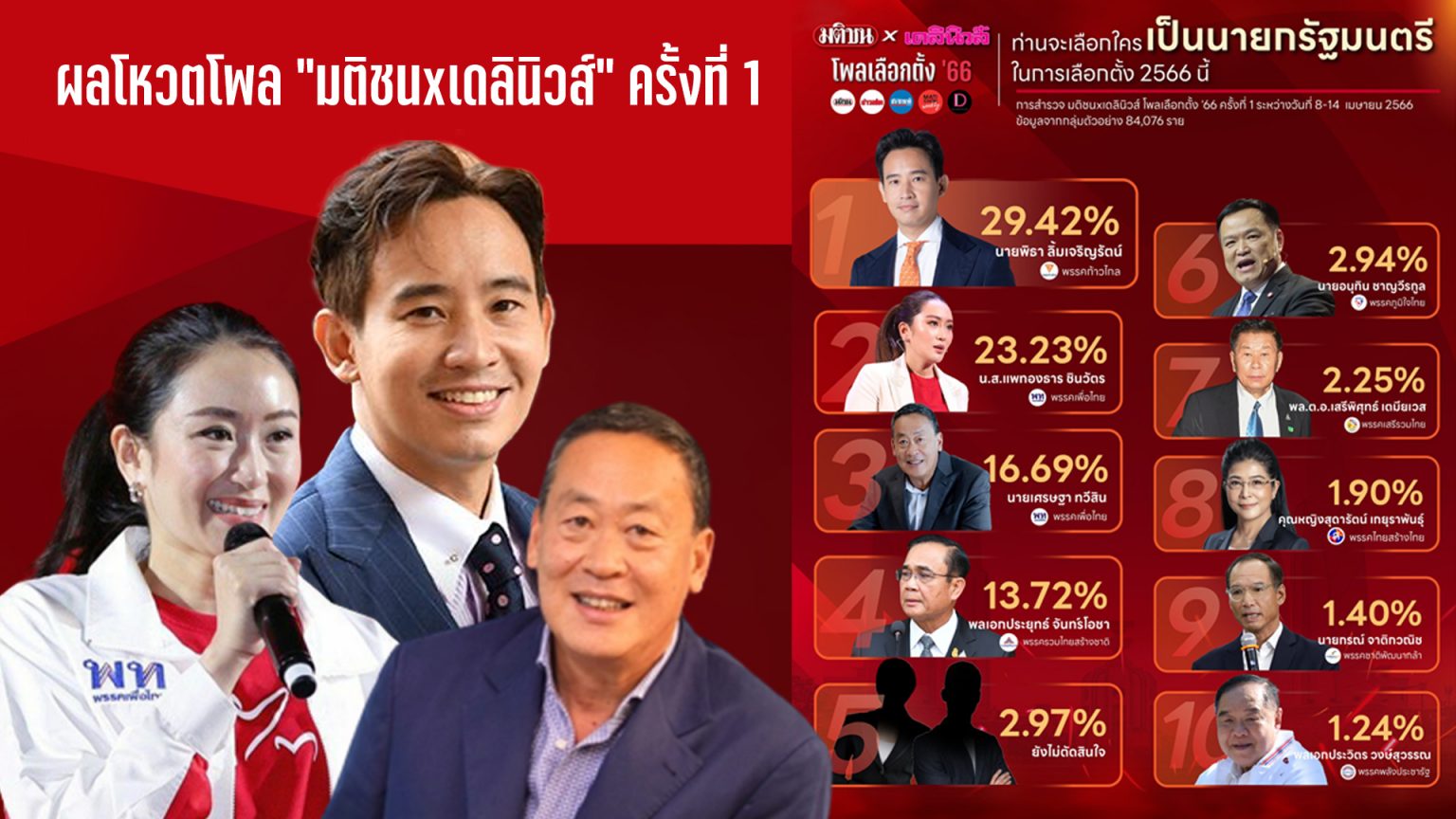 เมื่อวันที่ 15 เมษายน 2566 ผู้สื่อข่าวรายงานผลการโหวตโพลการเมืองครั้งประวัติศาสตร์เพื่อสะท้อนอนาคตผลเลือกตั้ง 2566 ซึ่งเกิดจากความร่วมมือของสองค่ายสื่อสารมวลชนชั้นนำระดับประเทศ “มติชน x เดลินิวส์ โพลเลือกตั้ง ’66 ครั้งที่ 1” ทำการสำรวจระหว่างวันที่ 8-14 เมษายน 2566 ผ่านช่องทางออนไลน์กระจายไปทั่วทุกภูมิภาค ทุกระดับอายุ อาชีพ การศึกษา และรายได้ทั่วประเทศ รวมกลุ่มตัวอย่างทั้งสิ้น 84,076 ราย และเป็นการโหวตแบบไม่ซ้ำไอพีแอดเดรส (IP Address)